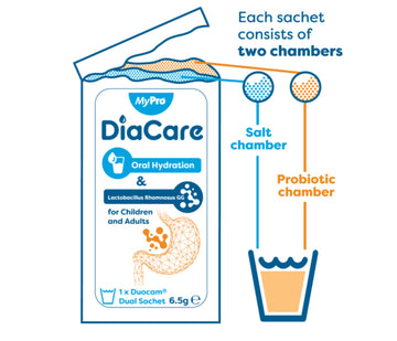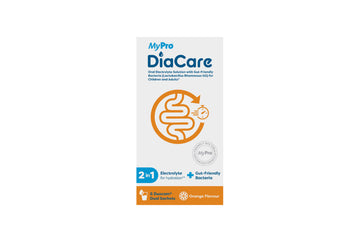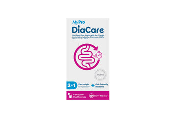 MyPro DiaCare is an oral electrolyte solution with added probiotics, designed for children (3+) and adults. It helps restore hydration, support digestion, and maintain electrolyte balance during diarrhoea, fever, or fluid loss — offering fast hydration with gut health support.