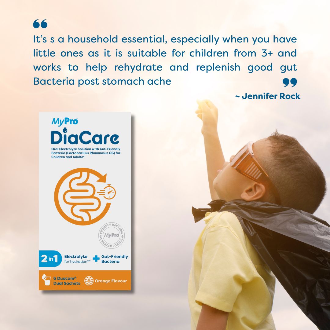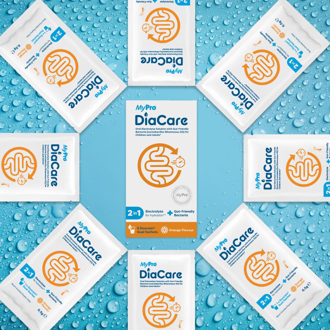 MyPro DiaCare is a 2-in-1 solution combining Electrolytes for Hydration* and Gut Friendly Bacteria