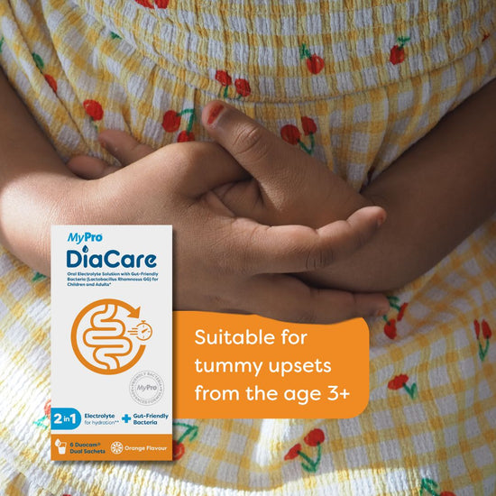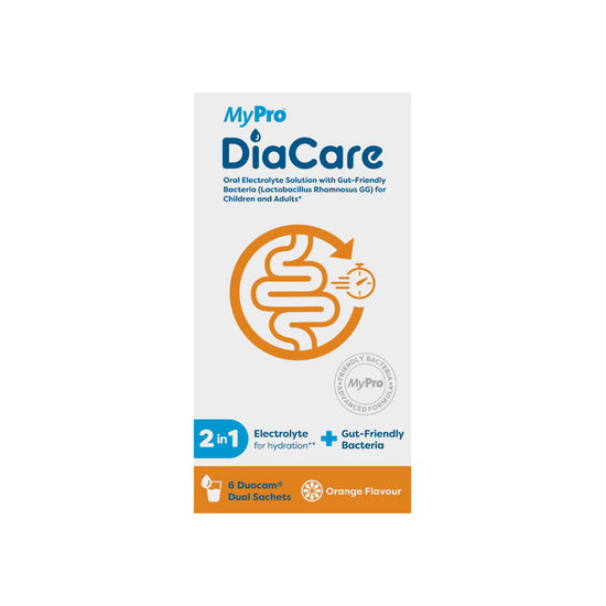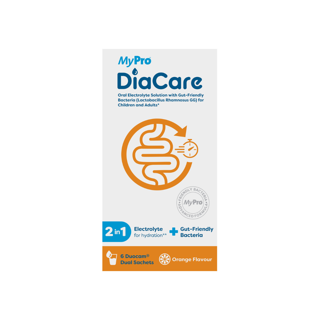 MyPro DiaCare is a 2-in-1 solution combining Electrolytes for Hydration* and Gut Friendly Bacteria.